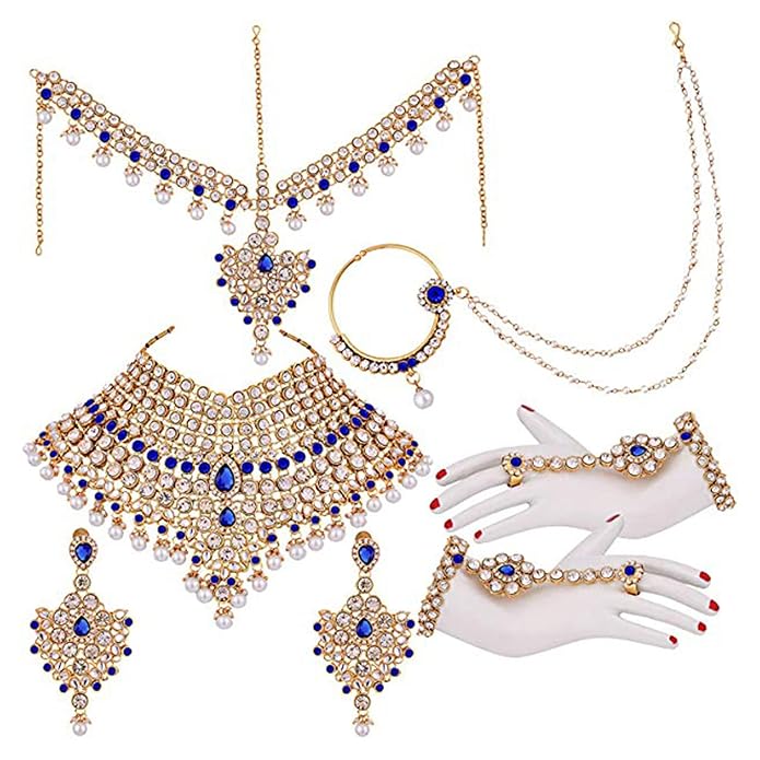PACKAGE CONTAINS: 1 Choker Necklace, 1 Pair of Earrings, 1 MathaPatti Maangtikka, 1 Pair of Hath Panja, 1 Nathiya